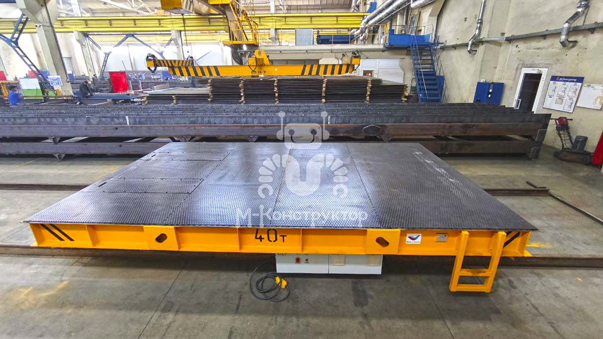 Тележка оснащена защитными рамками с концевыми выключателями для аварийной остановки и светозвуковой сигнализацией. Габариты платформы (5545×3300 мм) позволяют транспортировать крупногабаритные изделия, а грузоподъёмность при распределённой нагрузке до 40 тонн делает её универсальным решением для предприятий ЖБИ.
