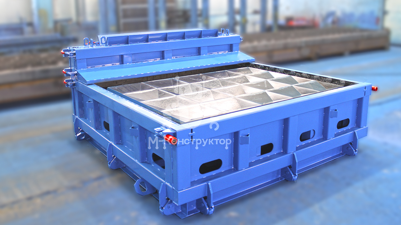 Переналадка формы позволяет в рамках одной оснастки получать оба типа изделий без изменения основной конструкции. Форму основания задают радиусная формующая поверхность, а также верхние и нижние вкладыши. Основание борта формируется двумя элементами — подвижным и съёмным, три наружных борта выполнены откидными, что обеспечивает удобство распалубки и стабильную геометрию изделия.