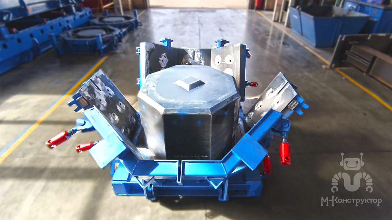 В металлоформе ККСП, в сечении которого восьмиугольник, крепления под закладные муфты (отверстия под заглушки) в двух диаметрах – 63 и 125 мм. Они расположены на подвижных бортах, раскрывающихся при распалубке. Также на каждом из четырех бортов предусмотрен петлеобразователь для перемещения изделия.