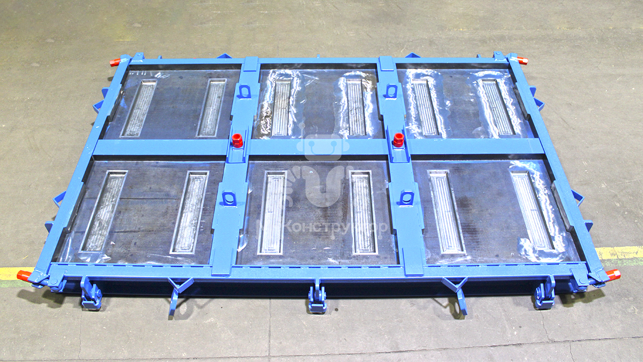Для формирования закрытого канала в комплект входят железобетонные крышки — они производятся в шестиместной металлоформе размером 2490×1520 мм. Каждая секция – отдельная крышка с габаритами 750×700×70 мм (ДхШхВ). На один лоток устанавливаются две крышки, образуя надежный закрытый дренажный канал. Для удобства распалубки форма выполнена с откидными бортами и двумя съемными делителями.