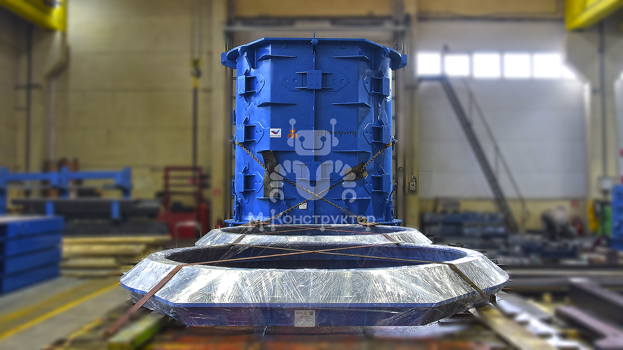 Внешний формообразователь представляет собой металлоконструкцию, в нижней части которой установлены 8 эксцентриковых замков, фиксирующих её к поддону. Снаружи обечайки 16 площадок под крепление вибраторов. При достижении опалубочной прочности изделия обечайка разбирается на две части для последующего съема ЖБИ. Перед этим необходимо снять верхнее формующее кольцо. Оно, как и поддон, выполнено с высокой точностью.