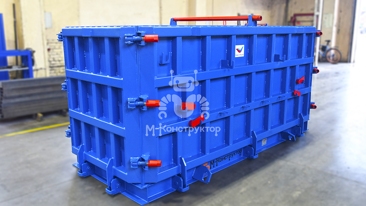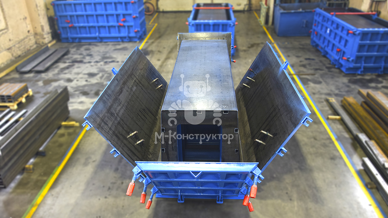 В рамках текущего заказа завод «М-Конструктор» изготовил два типа форм для производства лотков: с переналадкой, что дает возможность производства ЖБИ в габаритах 2970х1160х1310 и 2979х1160х1000 мм (ДхШхВ), и без переналадки с размерами изделия 2970х1160х1000 мм (ДхШхВ). Изменения размеров обеспечивают съемные вставки высотой 310 мм, которые устанавливаются в основание продольных бортов перед заливкой бетонной смеси.