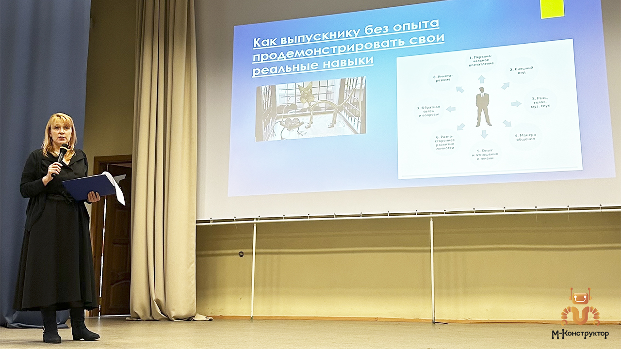 Завод «М-Конструктор» представила инспектор отдела кадров Ирина Стражева. В своём выступлении она объяснила, как работодатель оценивает навыки молодых специалистов: от первых строк в резюме до моментa, когда кандидат подходит к сварочному посту. Особый акцент Ирина Петровна сделала на честной самооценке, умении показать реальные умения даже при минимальном опыте и важности производственных практик.